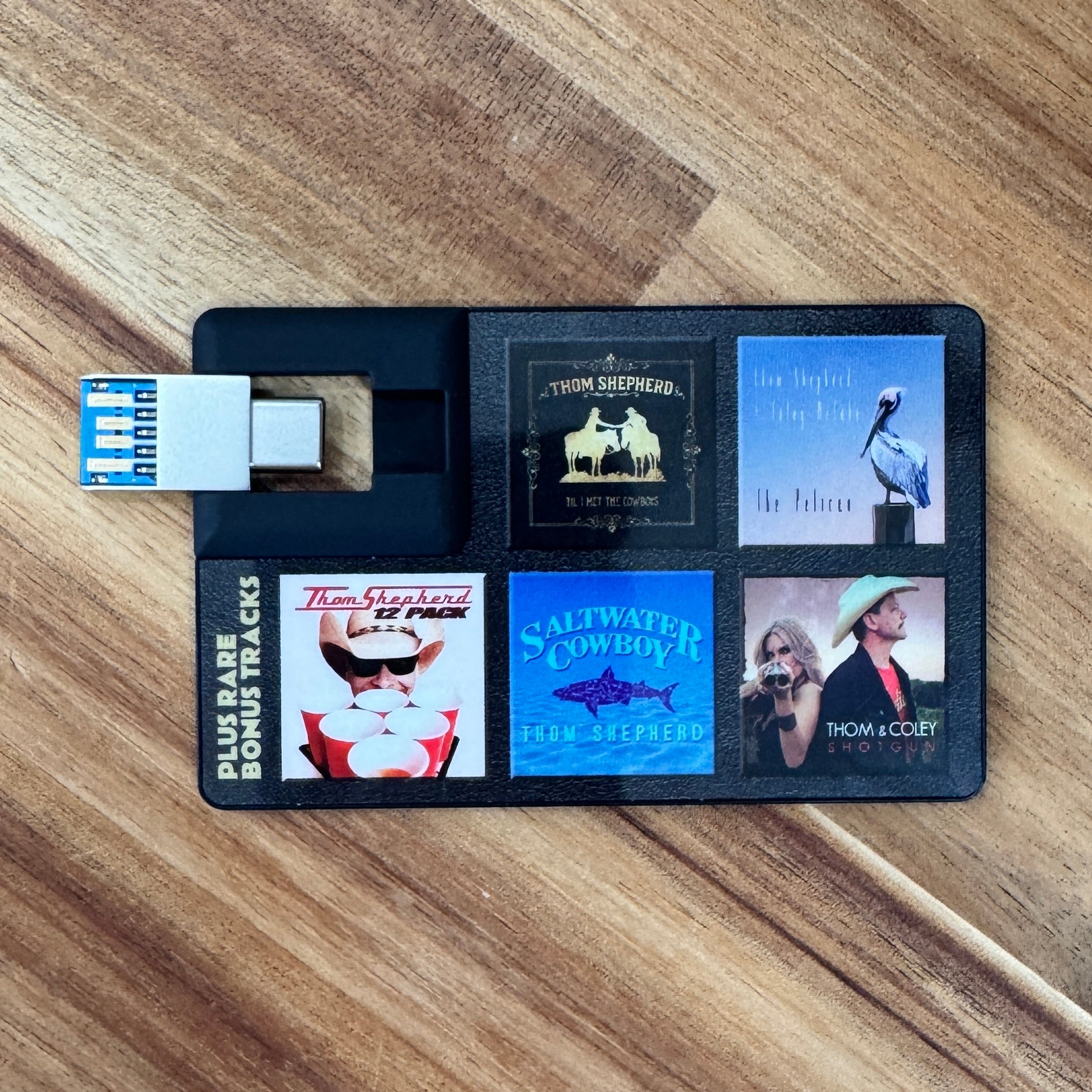 This flash drive includes Thom’s Til I Met The Cowboys EP, Saltwater Cowboy and 12Pack, Thom & Coley’s Pelican and Shotgun albums, and 8 bonus tracks