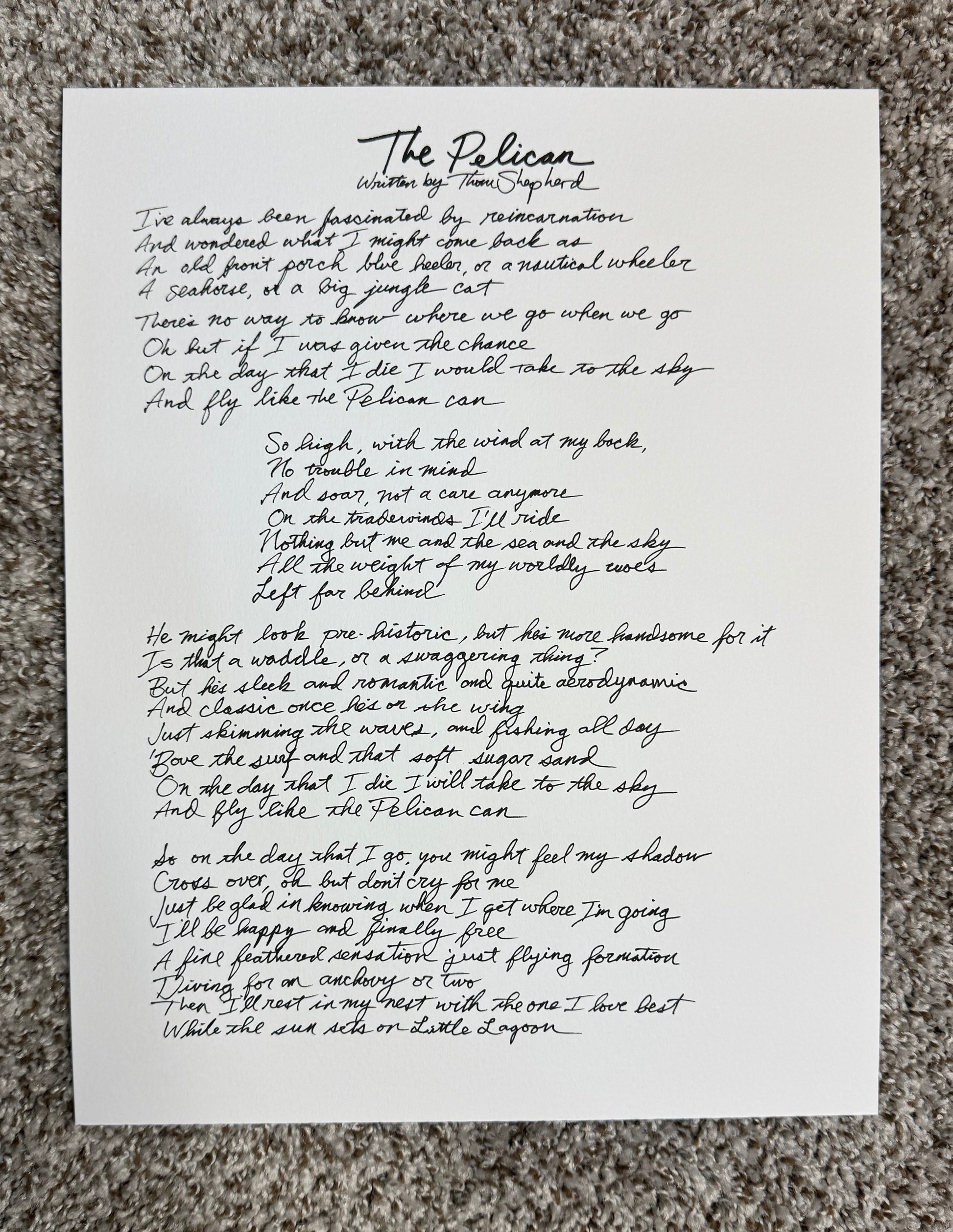 Each hand written lyric is a one of a kind piece, created by the song writer of "Riding with Private Malone", Thom Shepherd.