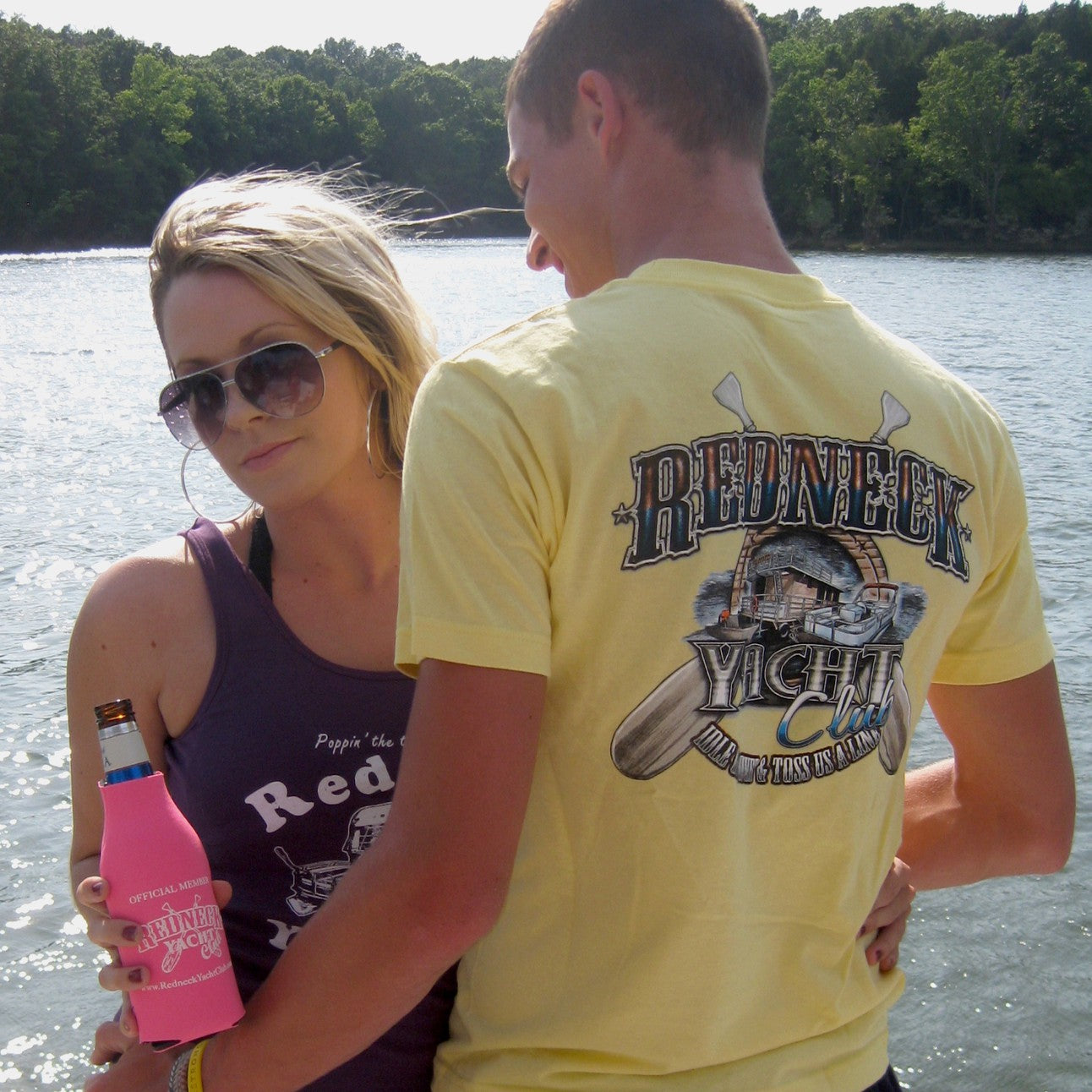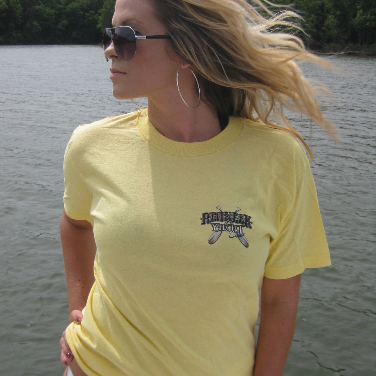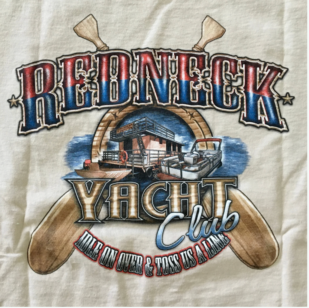Small full color logo on the front, large full color logo on the back with "Idle On Over and Toss Us A Line"